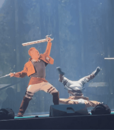 At the Saturday matinee, the fanfare was unlike anything I’d seen on Broadway before. Many attendees arrived in cosplay, clad in near-identical replicas of the cropped jackets worn by the Survey Corp in the anime. The energy in the theater felt more like a K-pop concert than the beginning of a musical. Fans screamed when their favorite characters walked (or flew) on stage and gasped when they saw the titans (giant, man-eating humanoids) come to life in the form of giant balloons manned by four different stagehands.