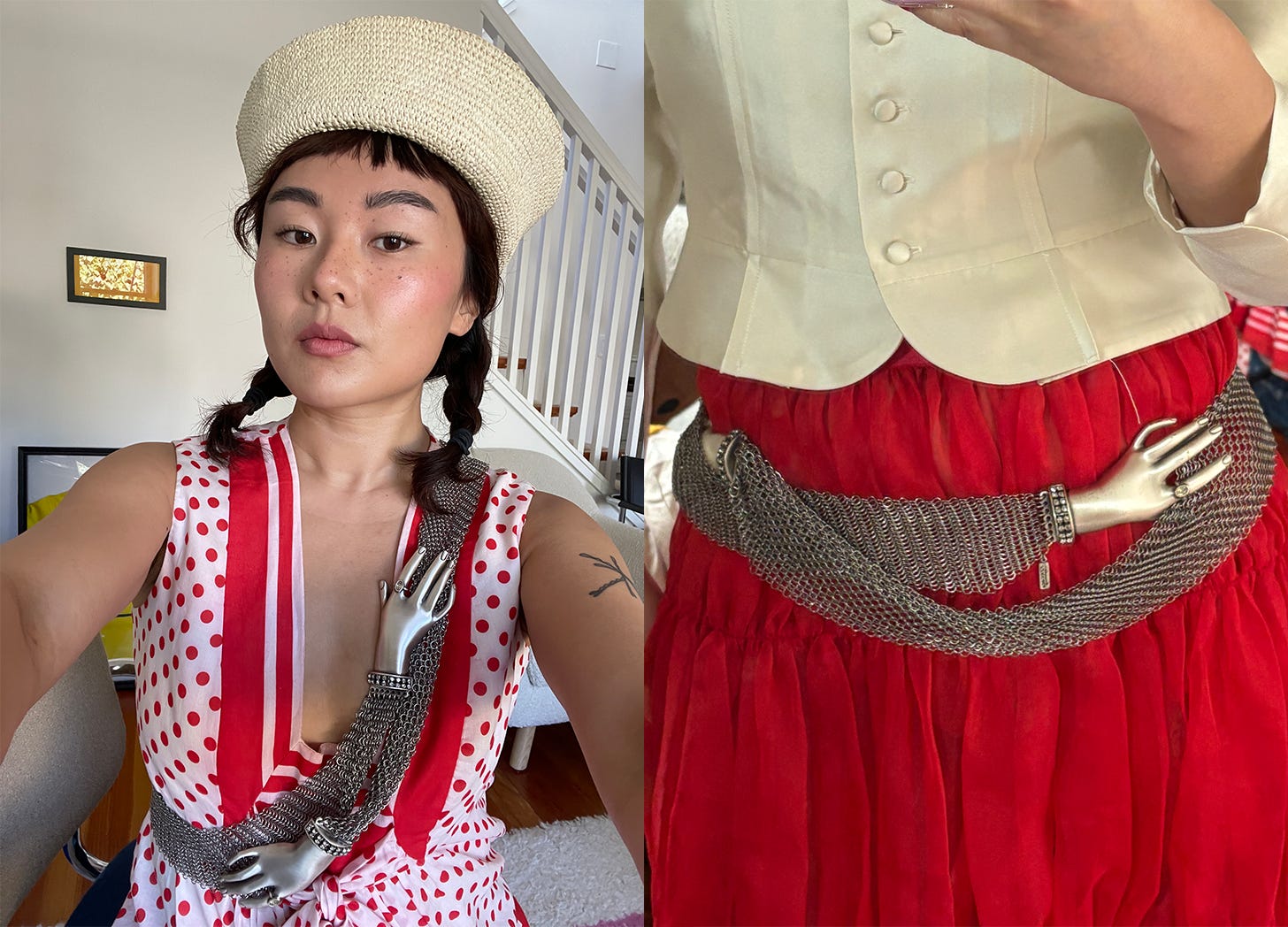 So one afternoon, while waiting out a sudden balmy downpour, I curled up in the hotel bed for a good ‘ol eBay browsing session. After playing around with keywords (chainmail, mesh, stainless steel, medieval, 70s, 80s), I stumbled upon a listing that I knew was THE ONE. It was a slinky chainmail belt from designer Anthony Ferrara, with two graceful hands on either end, meant to be worn such that the hands would appear to “clasp” across your body. My pupils dilated. I scrolled down to “make an offer” and entered $125. An hour later, I got the email alert that my offer was accepted.