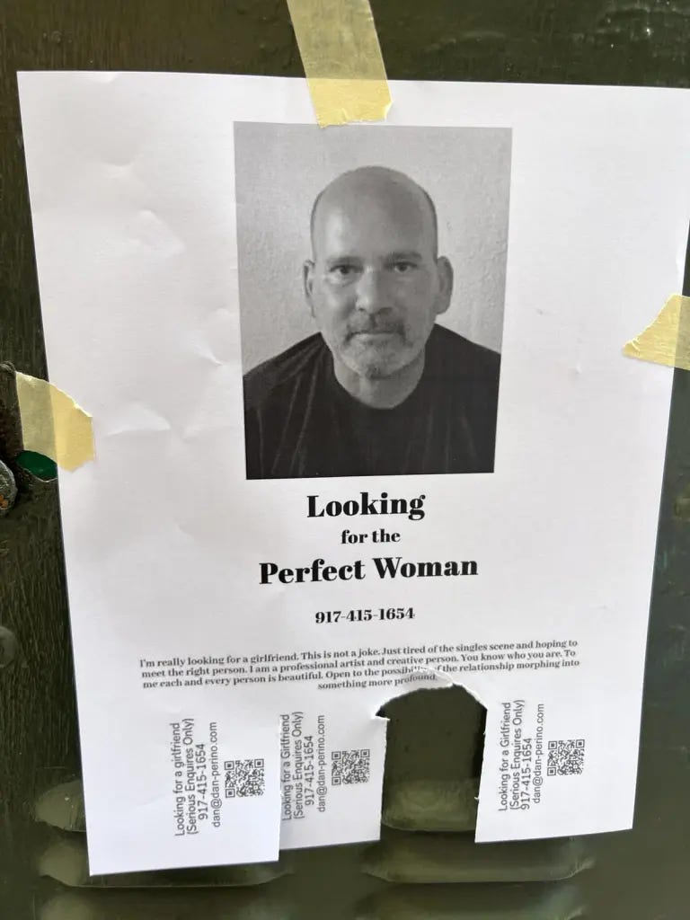 welcome to strong feelings! Essays by writers we love, in which they share their most impassioned opinions on a given subject. In today’s strong feelings, hot off the heels of her Great Flyer Experiment of 2024, writer Tess Garcia shares her interview with Mr. “Looking for the perfect woman” himself, Dan Perino, who has been plastering the streets of New York City with his face since 2014.