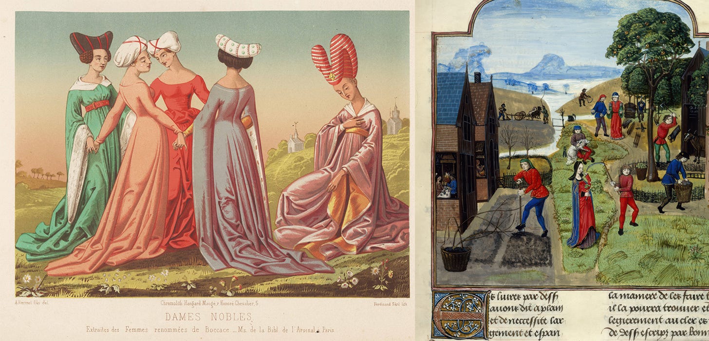 While there were differences across countries, centuries, and classes, there are prevailing silhouettes that have come to define the Medieval period. “Women would wear a kirtle — a straight, floor-length dress with a round neck and long sleeves,” says dress and design historian, Vicky Haddock, “And for men, they’d wear tunics, doublets, and hose.”