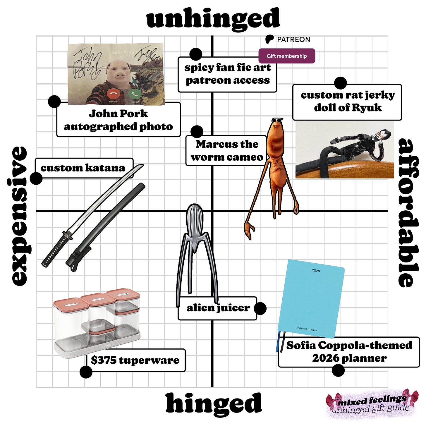 Every year, mixed feelings corrals our team and our most delightfully chaotic friends to bring you the Unhinged Gift Guide — a roundup of presents no sane person would ask for, but everyone secretly wants. This isn’t your run-of-the-mill lineup of gifts for your best friend, or even advice on what to get your estranged aunt. It’s a spectrum of hinged-to-unhinged selects curated by the most whimsical people we know. Consider it a sliding scale of items you didn’t know you needed but now simply cannot live without. From spicy fan art to decorative blades and custom dolls, some of these picks are “normal,” sure, but many are handpicked from the silliest depths of the internet.