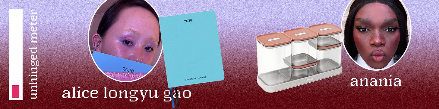 Important Flowers Planner by Sofia Coppola. I needed this so badly I pre-ordered it. It’s the Important Flowers planner published by Sofia Coppola. I love the aesthetic. I had one for 2025, too, that I added jewelry stickers to. I am so happy that the 2026 planner is blue. Last year’s was purple and it will be so cute to have a couple of them from different years lined up on my bookshelf. I like writing things down, but eventually all my to-dos and reminders become a giant mush of porridge. To have pages printed with lines, dates, weeks, and months help me quite a bit. I can also write down places or thoughts on the extra pages in this planner. I just love to stay organized and make my dreams come true < 3333 — Alice Longyu Gao, musician & performance artist